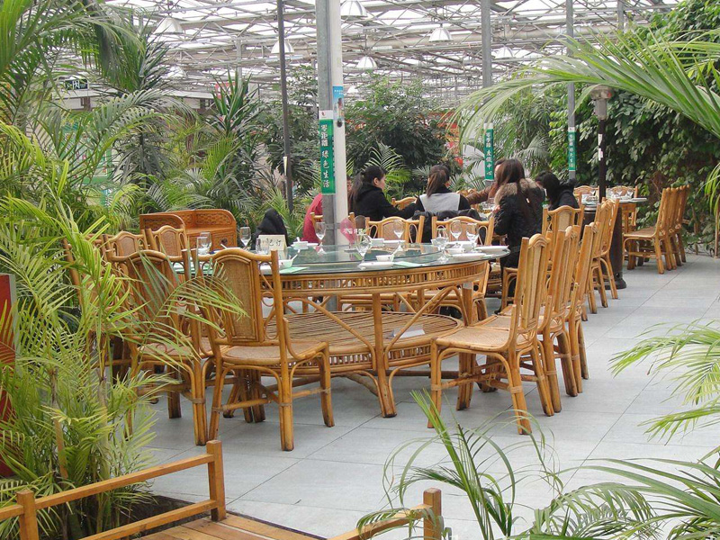 生態溫室綜合運用建筑學、園林學、設施園藝學、生態學等相關學科知識進行規劃、設計和建設,以設施調控技術、農藝栽培及管理技術來維護餐廳的優美環境,形成以綠色景觀植物為主,蔬、果、花、草、藥為輔的植物配置格局,結合假山、瀑布、小橋流水、竹木亭閣等園林景觀,全方位立體展現綠色、優美、宜人的就餐環境。